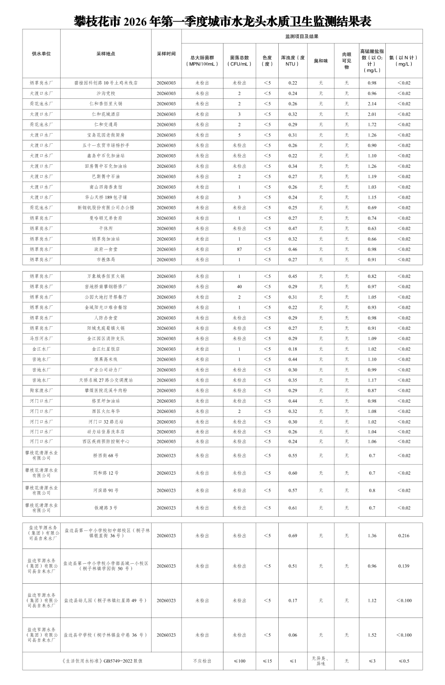 攀枝花市城市饮用水卫生状况信息公示表(2026年第一季度)