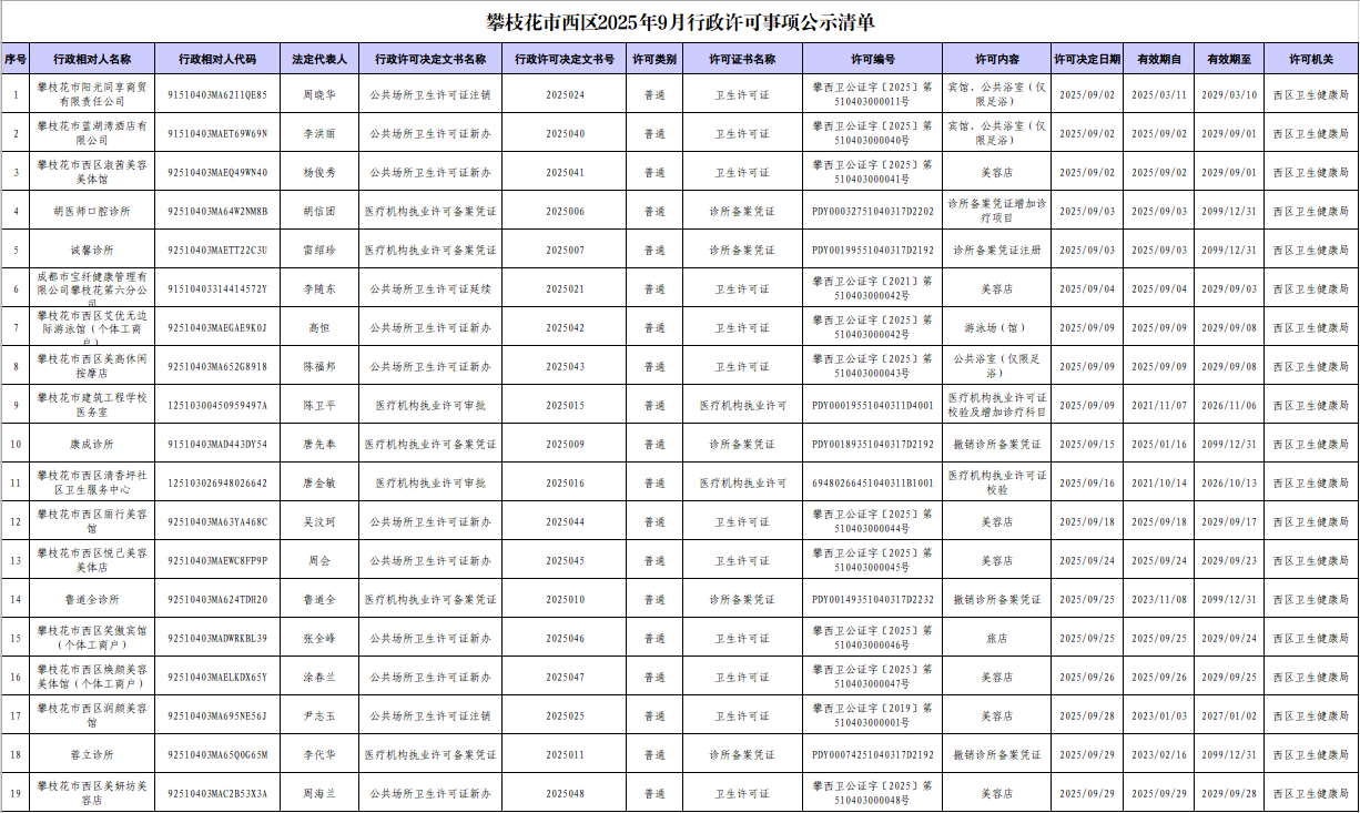 攀枝花市西区2025年9月行政许可事项公示清单