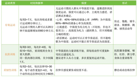 建议每周有氧运动、抗阻训练、柔韧性训练搭配进行。