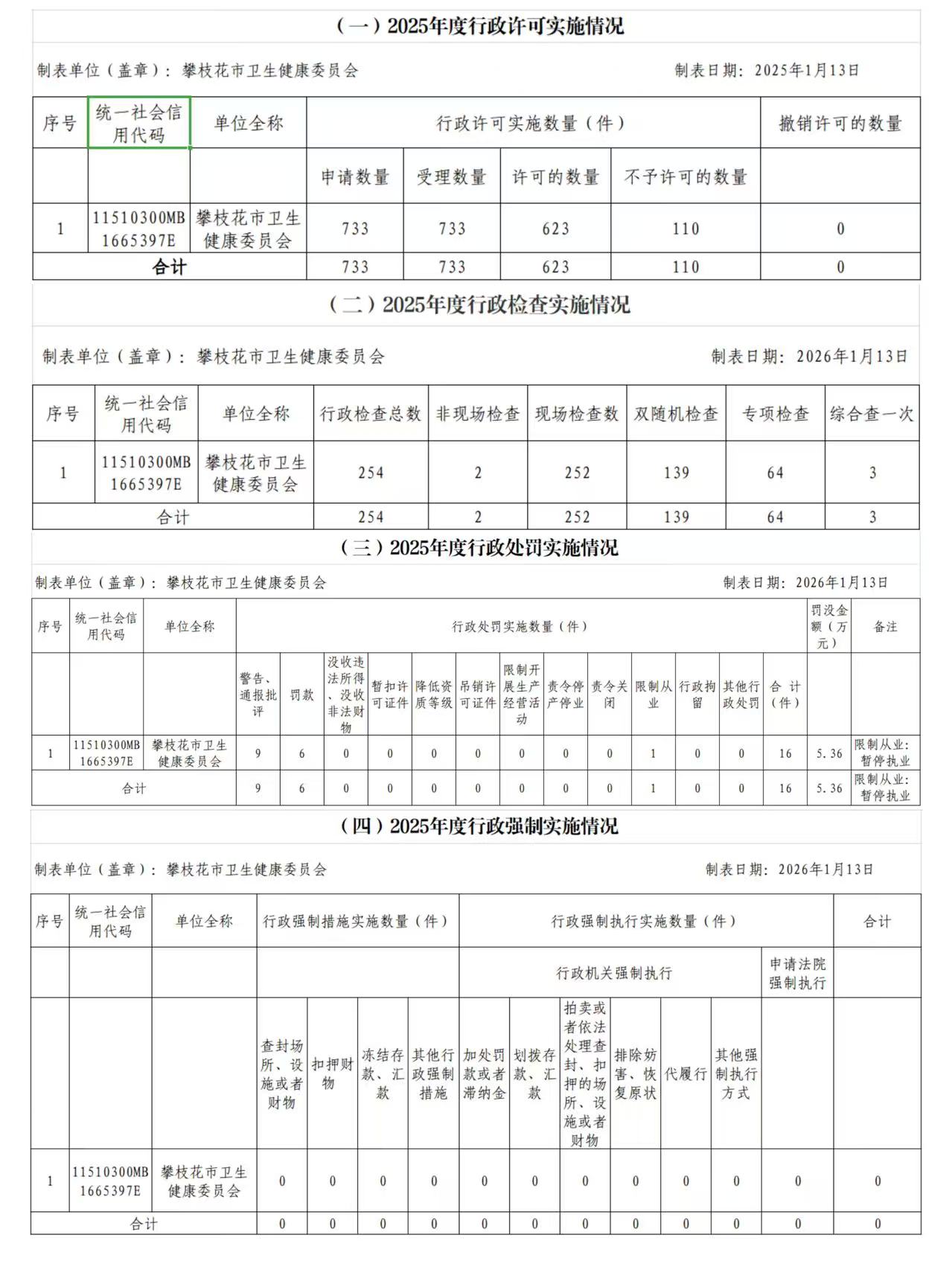 攀枝花市卫生健康委员会2025年度行政执法情况公示